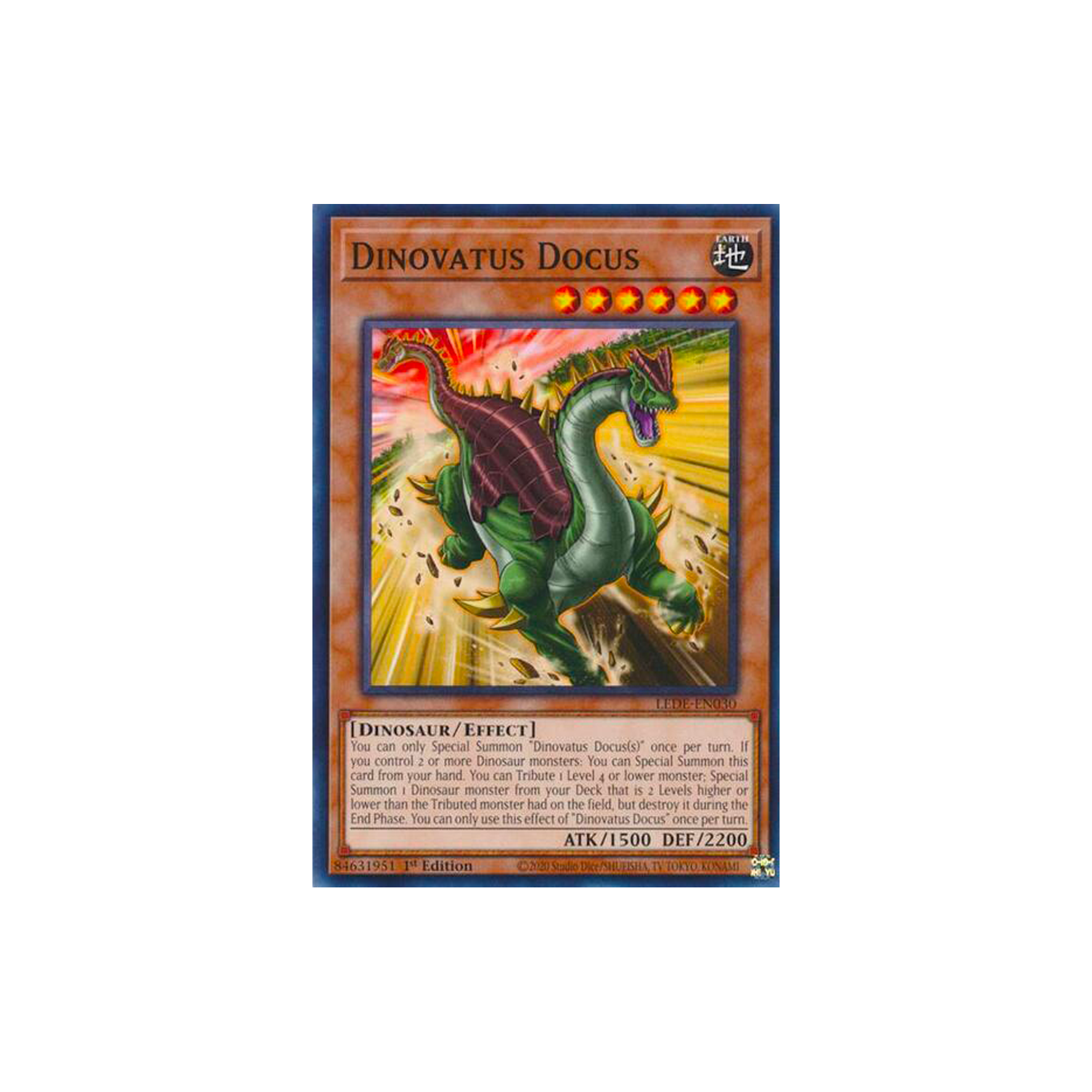 You can only Special Summon "Dinovatus Docus(s)" once per turn. If you control 2 or more Dinosaur monsters: You can Special Summon this card from your hand. You can Tribute 1 Level 4 or lower monster; Special Summon 1 Dinosaur monster from your Deck that is 2 Levels higher or lower than the Tributed monster had on the field, but destroy it during the End Phase. You can only use this effect of "Dinovatus Docus" once per turn.